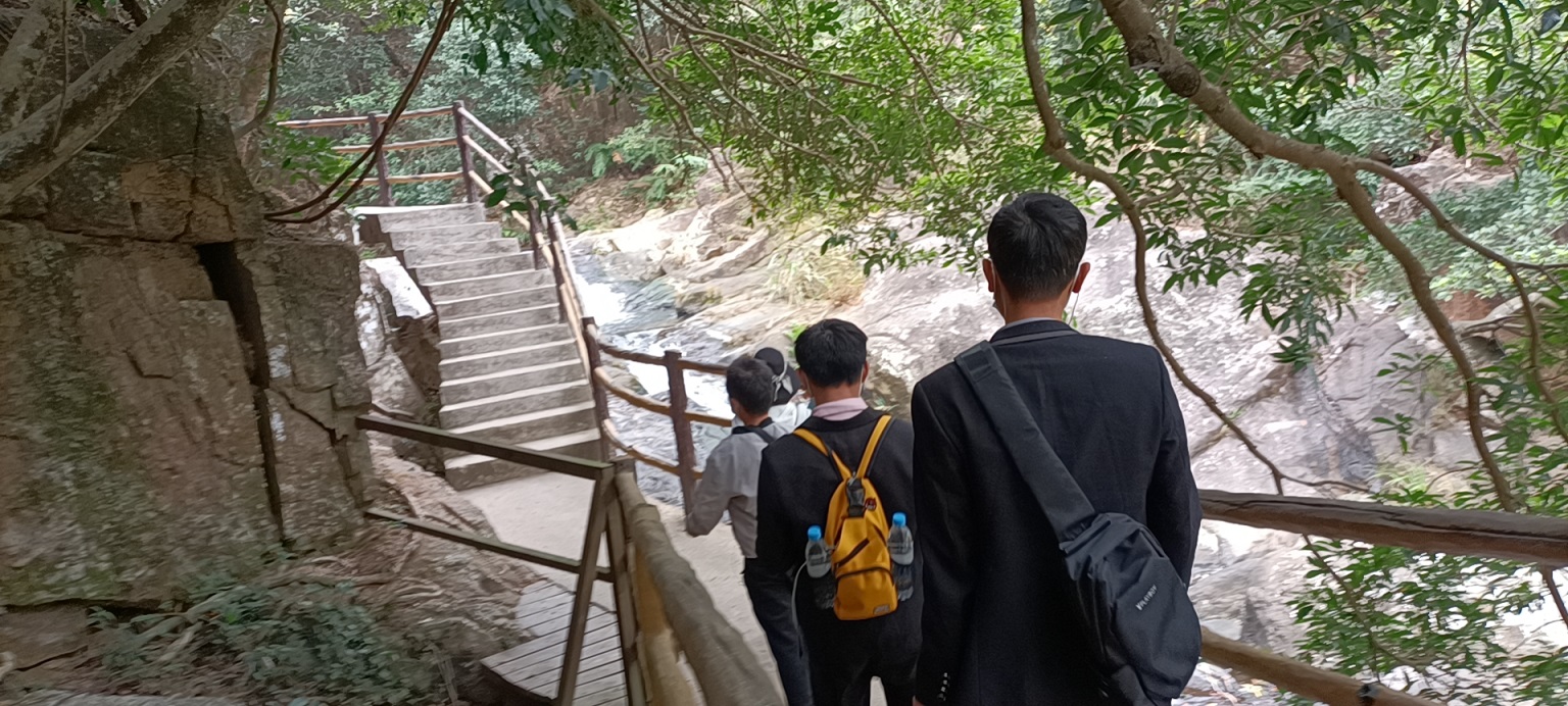 道阻且長(zhǎng),行則將至。從公司結(jié)隊(duì)出發(fā),齊聚一堂,一同到鄰近的地道餐館,用一碗配料爆滿、熱氣騰騰的絕味早餐開啟為期兩天的自駕行之旅。吃完早餐,休整片刻,我們便馬不停蹄地趕往馬巒山。行至馬巒山腳,一行人背上必備物品,一同上山。山雖無(wú)言,但物有聲。我們與伙伴一同前行,也與飛流直下的瀑布、潺潺而流的溪水和嘩嘩作響的枝葉同行。馬巒山的階梯多且陡,登頂慢且難。盡管登頂不易,但我們不曾放棄,走走停停,看山看景,步步前行,終究登上了馬巒山山頂。